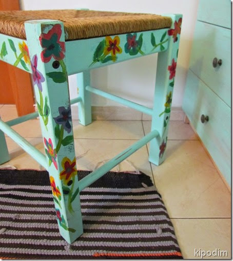 והיה גם שרפרף אחד, ישן מאוד, במקור בצבע עץ בהיר, שנהניתי כל כך לעבוד עליו ולהשתולל עם צבעי הפרחים -